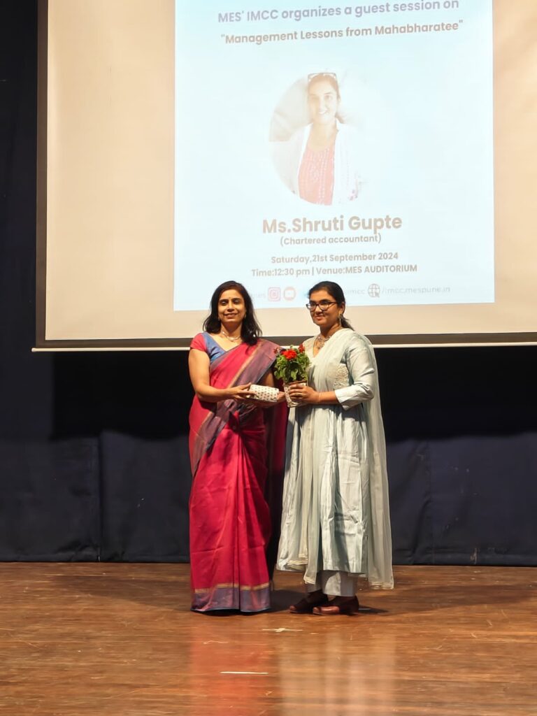 The guest session on “Management Lessons from Mahabharatee” was held on 21st September 2024 and aimed to explore the rich themes, characters, and cultural significance of this ancient epic. Ms.Shruti Gupte, guest speaker for the session explained the importance of five ladies of mahabharat ( Draupadi, Kunti, Gandhari, Subhadra, Satyavati.)