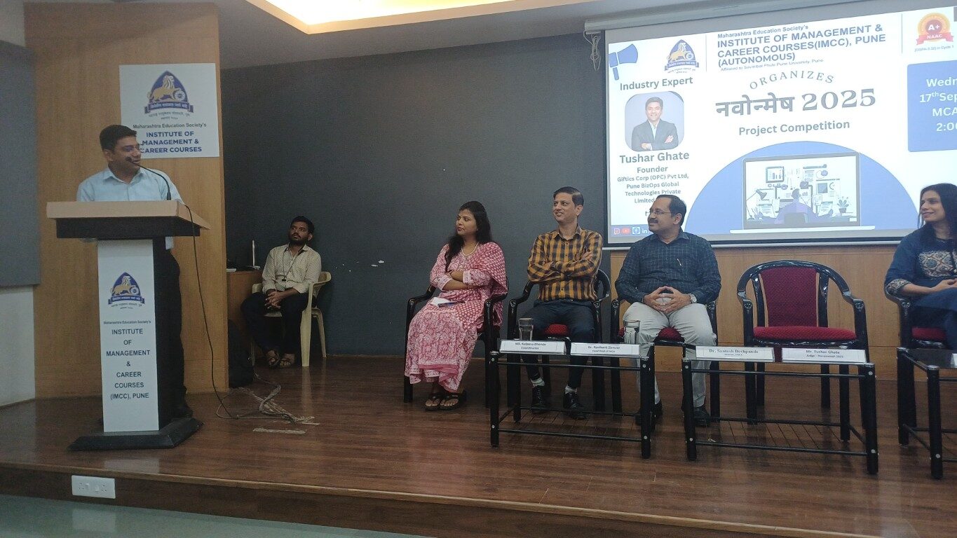 The MES Institute of Management and Career Courses (IMCC) successfully organized the “Navonmesh” Project Competition on 17Th September ,2025. This competition aimed to provide a dynamic platform for students to showcase their innovative talents and encourage the development of practical solutions that simplify everyday tasks. All shortlisted projects were evaluated by Mr. Tushar Ghate, industry expert, who provided insightful feedback and guidance to the participants. Following are the details of selected projects