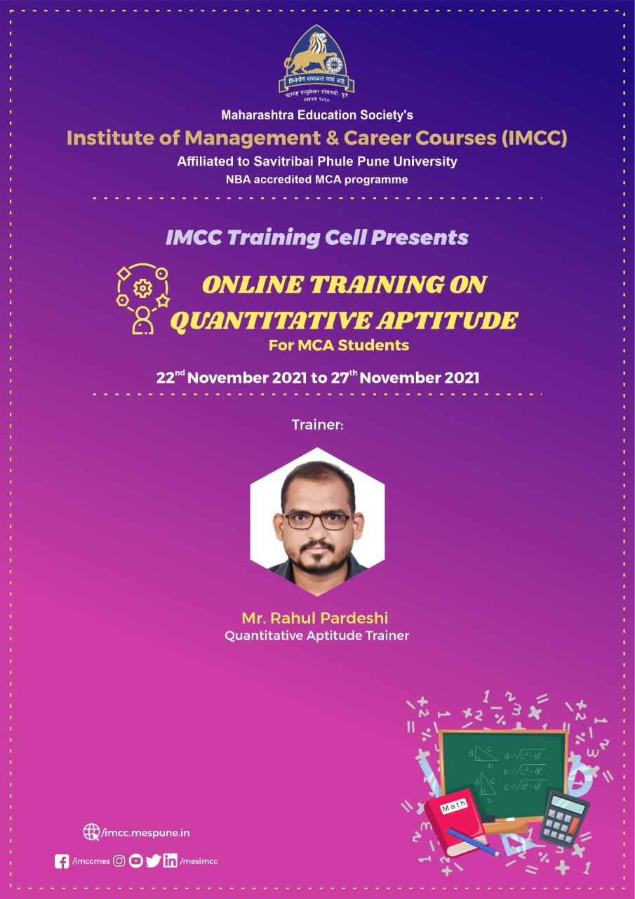 This training will be in continuation to the first session on Aptitude training conducted online in June 2021. The sessions will focus on covering important concepts of Aptitude such as Number System ( LCM& HCF ), Partnership,Time & Work,Probability,Permutation & Combination, Simple Interest & Compound Interest and many more.