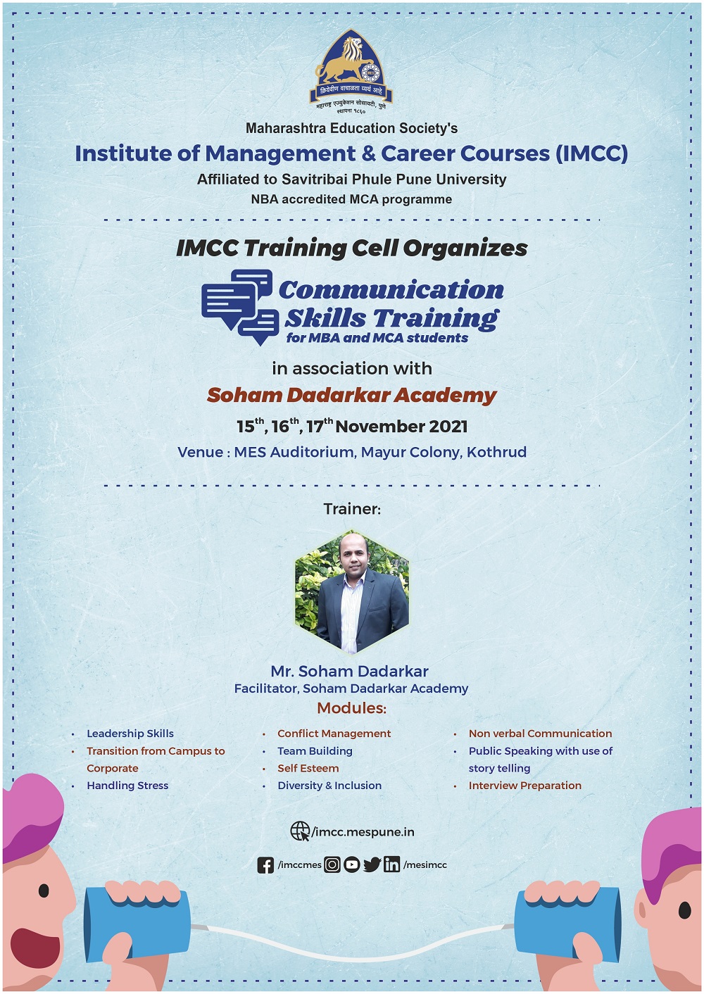 On 15th, 16th and 17th November 2021, IMCC Training Cell will be organizing three days full day training sessions on Communication Skills for MBA and MCA students. During these three days, following modules will be covered